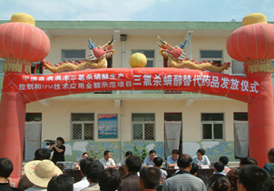 仪式上,洛川县政府马县长做了重要讲话,县项目办与各示范乡签订了《替代药品发放与使用协议》,示范区代表永乡乡乡长做了认真实施好项目IPM示范技术的表态发言。县项目办将该项目下无偿为示范区配送的价值6.84万元的三氯杀螨醇替代药剂15%哒螨灵乳油1.8吨,全部发放到5个示范乡镇的3773户果农手中。