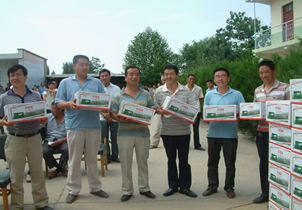 仪式上,洛川县政府马县长做了重要讲话,县项目办与各示范乡签订了《替代药品发放与使用协议》,示范区代表永乡乡乡长做了认真实施好项目IPM示范技术的表态发言。县项目办将该项目下无偿为示范区配送的价值6.84万元的三氯杀螨醇替代药剂15%哒螨灵乳油1.8吨,全部发放到5个示范乡镇的3773户果农手中。