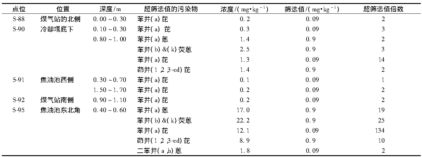 该项目所在地位于北京城区, 原为某大型机械加工厂的煤气制备厂, 总面积为840 000 m2, 成立于1958年, 至2011年彻底停产转为文化产业园, 主要从事钢铁热加工和机加工生产。位于南厂区西侧的煤气站建于1969年, 1970年正式投产, 采用发生炉制煤气技术为整个厂区提供动力燃料, 1998年停止使用, 并于2003年因抵债将煤气站进行拆除, 而其他设施如焦油池等仍然存在。2009年此机械加工厂通过场地调查和风险评估, 结果表明仅原煤气站存在污染, 污染物为多环芳烃 (PAHs) (污染物含量及修复目标值如表1、表2所示) , 修复面积约10 800 m2, 修复土方量约21 600 m3, 需清理焦油量为734 m3。2011年采用异位技术对原煤气站区域实施了场地修复。