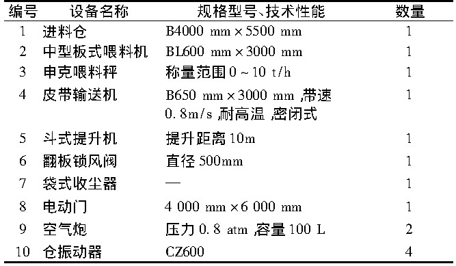 3) 为方便污染土入窑尾高温段焚烧, 设计在窑尾加装物料提升装置, 见图2。入窑设备情况见表4。预处理后的污染土壤用专门的运输车从充气大棚储库转运到预热器塔架旁的存料斗, 为避免卸料时扬尘造成的二次污染, 将对卸料区进行密封。从卸料斗倾出的污染土经板式喂料机进入皮带秤计量, 计量后的土壤经提升机提升后由管道进入窑尾烟室喂料点, 送入窑尾烟室高温段焚烧, 完成污染土壤的入窑过程。整个上料装置须进行密闭, 避免粉尘外扬。