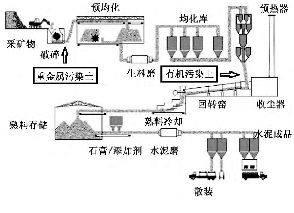 水泥生产是各种无机矿物原料经配比均化后, 在1 400℃以上的高温, 经过固相反应来制备水泥产品。水泥窑焚烧技术就是将污染土按一定比例加入水泥窑, 利用其高温将有机物污染物彻底分解为无害物质, 重金属污染物则固化在水泥产品的晶格中, 达到消除污染的目的。根据水泥生产工艺特点, 重金属污染土可以从原料直接加入, 而含有有机污染物的土壤必须从高温段入窑焚烧, 详见图1。