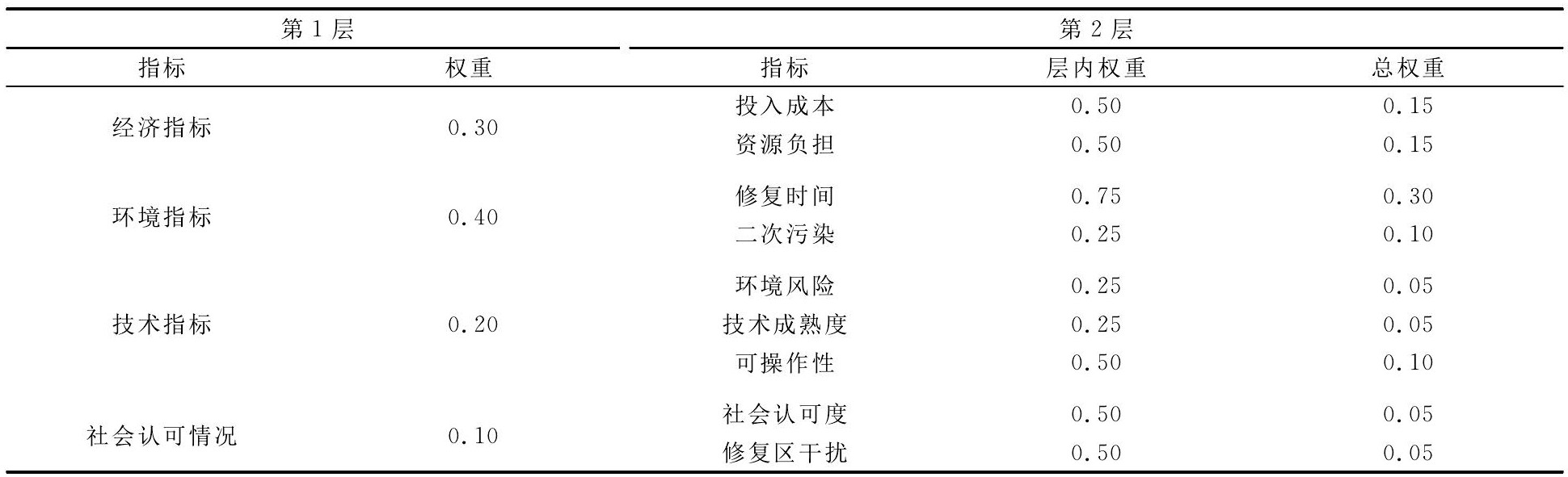 现有污染场地修复案例中,有关于修复方案的制定及应用方面还存在诸多的不足,如各修复技术在不同地域、场地以及施工条件下的修复效果存在差异。 评价方法采用模糊数学法确定指标范围,可能存在范围判断不准确。此外,许多修复方案制定时,各因素的权重由专家确定或参考其他相关案例,针对各个污染场地所需着重考虑的重要指标往往不能体现[6]。