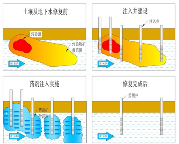 ISCO技术最早应用于污染源带处理氯代有机溶剂和石油类污染物,其处理效果依赖于场地的准确调查和注入试剂传输系统的设计,一般具有节约时间和费用的特点。ISCO技术可以和其他修复技术如生物修复技术、自然衰减技术等联合使用。
