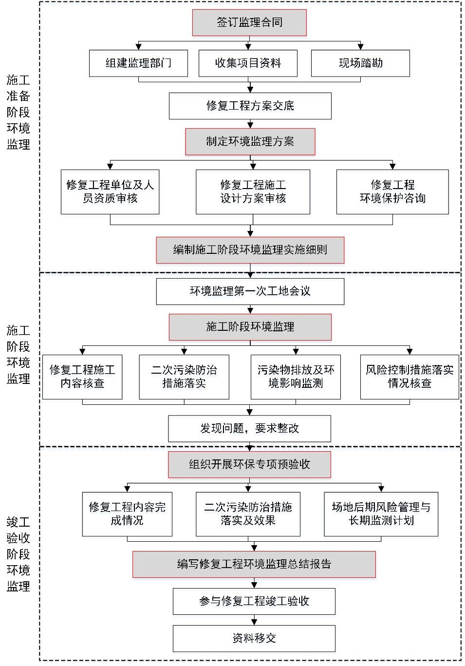 污染场地修复工程环境监理作主要包括施准备阶段、段环境监理和竣工验收阶三个的作,详细流程见下图。